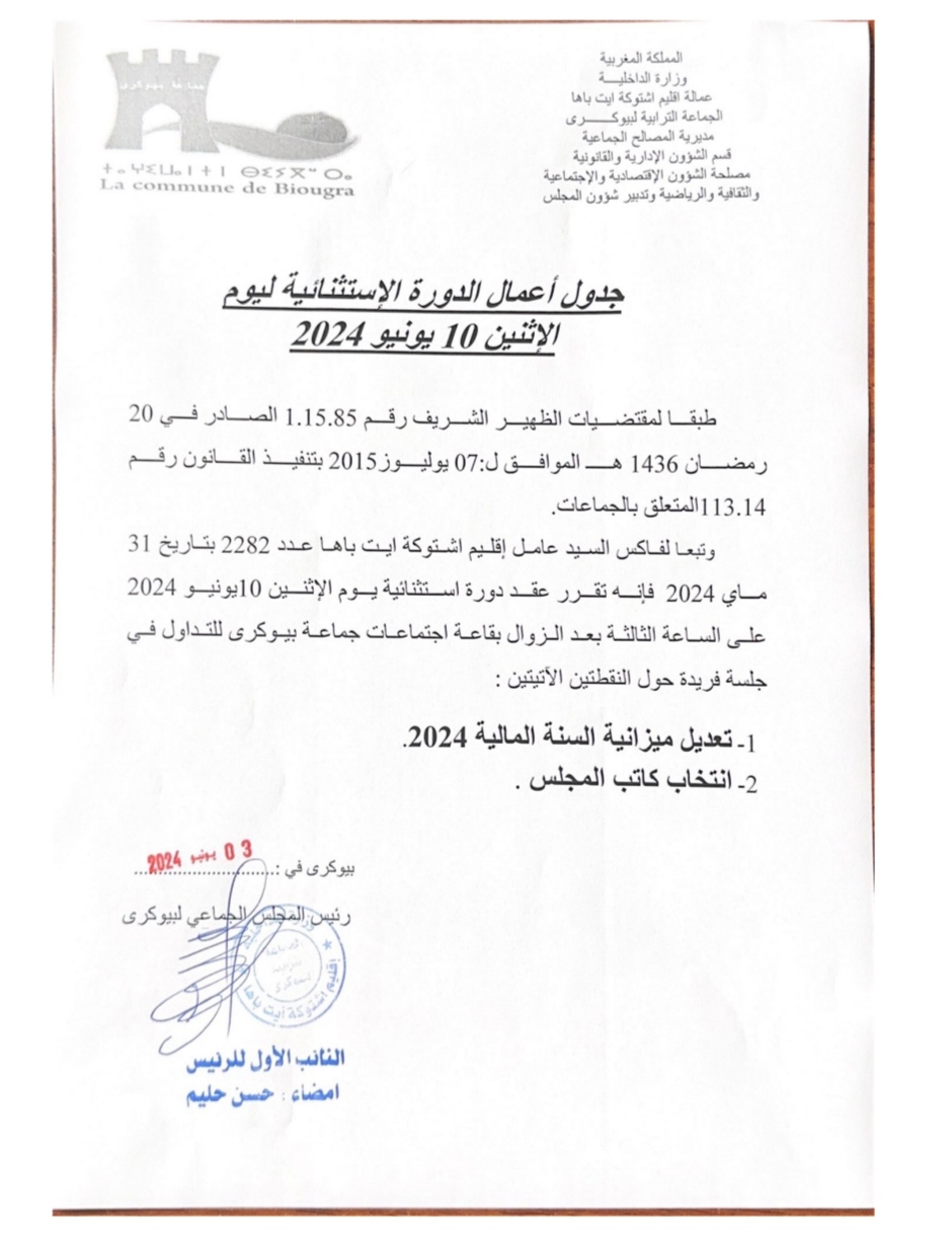 المجلس الجماعي لبيوكرى يحدد جدول أعمال الدورة الاستثنائية ليوم الاتنين 10 يونيو 2024