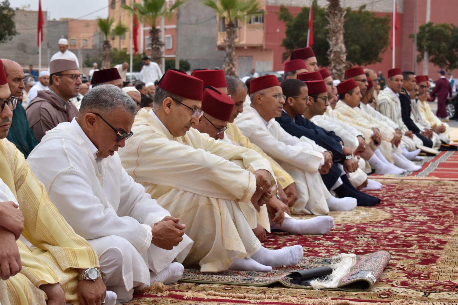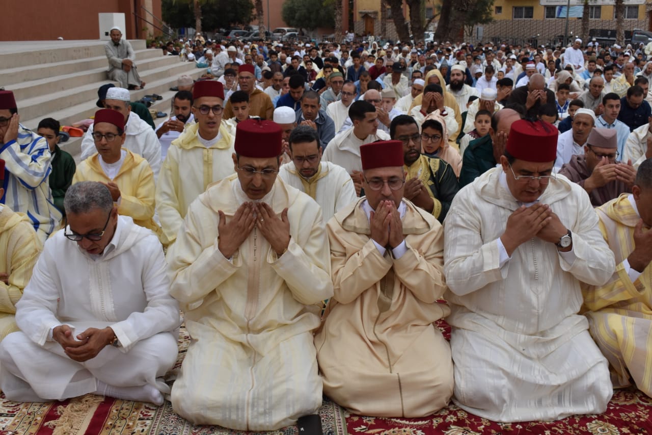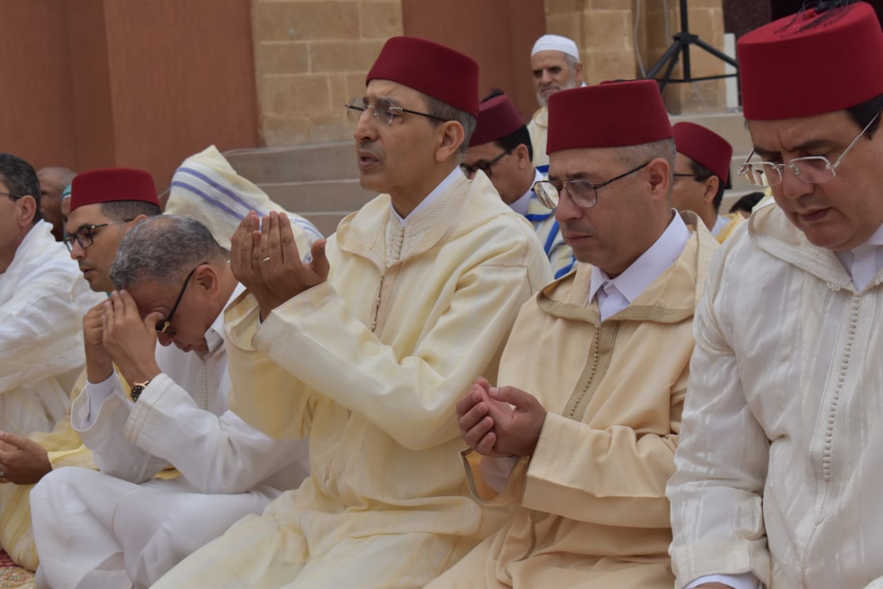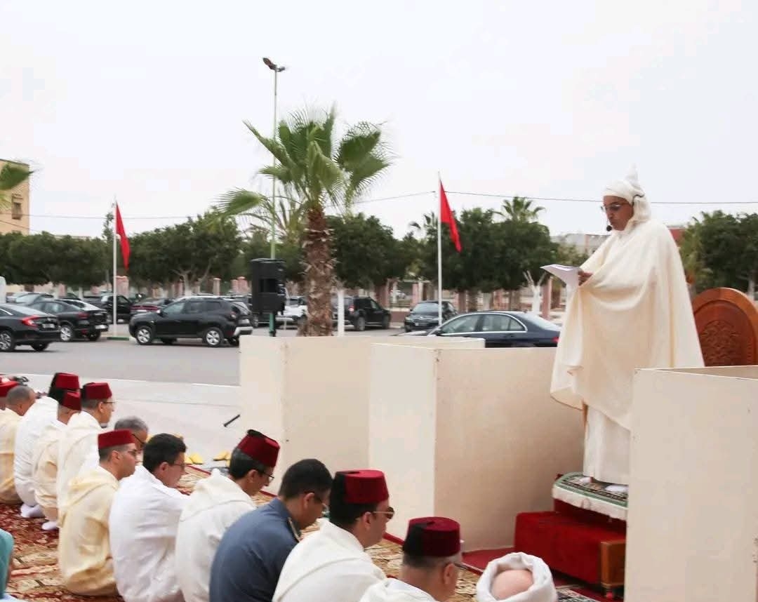 مراسيم صلاة وخطبة العيد التي سادتها أجواء روحانية ومشاعر إيمانية فياضة احتفاء وتعظيما لهذه الشعيرة الإسلامية الجليلة تم خلالها الدعاء بالنصر والتمكين لجلالة الملك محمد السادس نصره الله ولصاحب السمو الملكي الأمير مولاي الحسن بالسداد والتوفيق وأن يشد عضد جلالته بشقيقه الأمير مولاي رشيد وسائر أفراد الأسرة الملكية الشريفة .